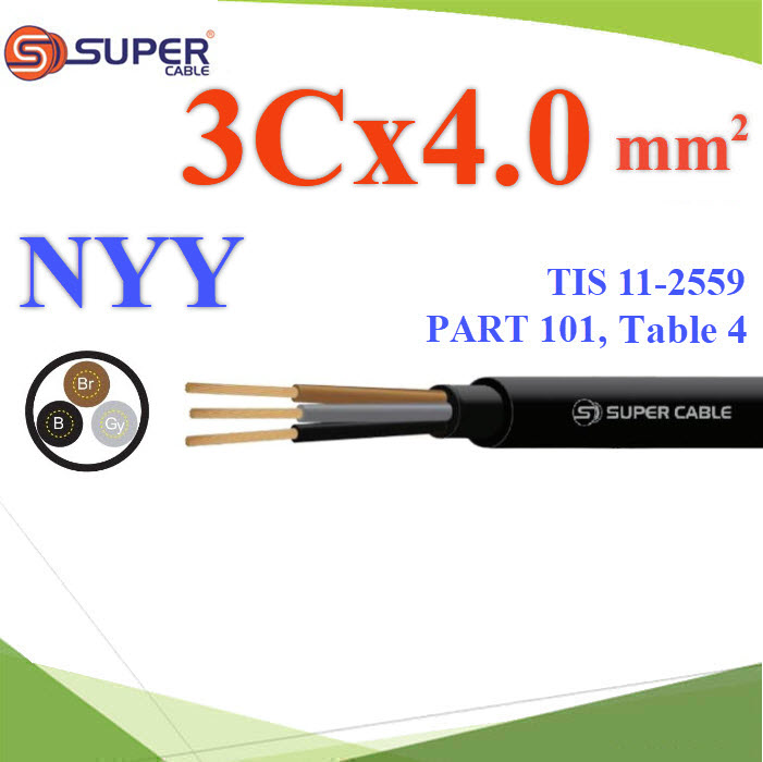 | NYY-3Cx4sq   มีสต็อกในประเทศไทย สายไฟ NYY ภายนอก 3x4.0 Sq.mm. S.SUPER 450/750V ร้อยท่อฝังดิน หรือฝังดินโดยตรง NYY 3x4.0 Sq.mm. 450/750V Solid or Standard Conductor PVC Insulated and Sheathed S.Super ราคา 143 บาท  |