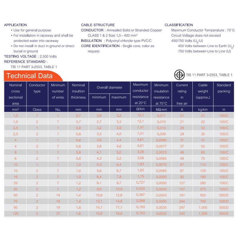 สายไฟ THW 60227 IEC01 ทองแดงฉนวนพีวีซี ขนาด 240 Sq.mm. สีดำ (ระบุความยาว) Code : THW-IEC01-240-BLACK Cable 60227 IEC 01 THW Copper Conductor PVC Insulated 240 Sq.mm Black สายไฟฟ้าใช้งานที่แรงดันไฟฟ้าไม่เกิน 300/500 V. หรือ 450/750 V. และอุณหภูมิตัวนำไม่เกิน 70 องศาลักษณะ สายกลมแกนเดียวภายในประกอบด้วยเส้นลวดตัวนำทำด้วยทองแดง หุ้มฉนวนพีวีซีชั้นเดียวเหมาะสำหรับ ใช้งานทั่วไป เดินในช่องเดินสายและต้องป้องกันน้ำเข้าช่องเดินสาย ห้ามร้อยท่อฝังดิน หรือฝังดินโดยตรง 60227 IEC 01 (THW) 450/750 V. 70C SOLID OR STRANDED CONDUCTOR.PVC INSULATED, SINGLE CORE. TIS 11-2553 PART 3, TABLE 1 |